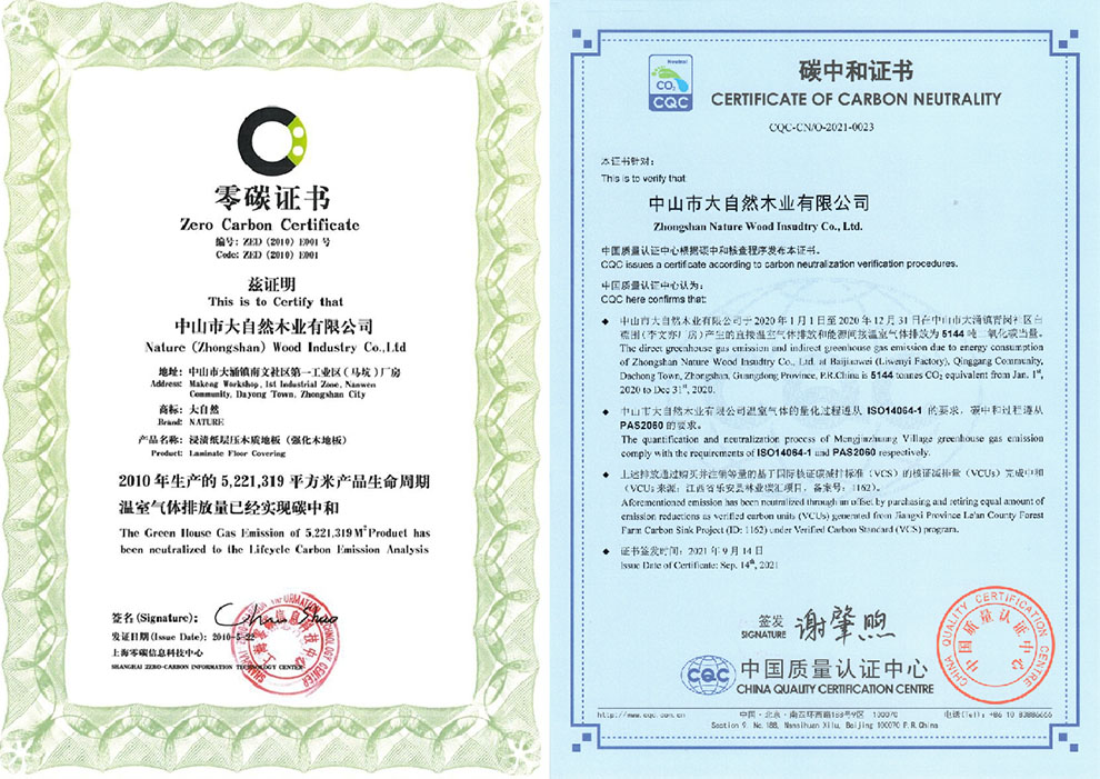 大自然家居始終堅持綠色低碳發(fā)展戰(zhàn)略。2021年9月14日,中國質(zhì)量認證中心(CQC)向大自然家居頒發(fā)《碳中和證書》,標志著大自然家居成為行業(yè)首個實現(xiàn)碳中和的“燈塔”企業(yè)。早在2010年就推出了大自然“零碳”地板,通過采取改良生產(chǎn)工藝、優(yōu)化物流布局、減少包裝材料等措施,實現(xiàn)生產(chǎn)過程碳排放量的控制與降低,獲得國際零碳專業(yè)委員會“碳中和”認證,同年鋪進了中國第一座零碳排放公共建筑——上海世博會零碳館。