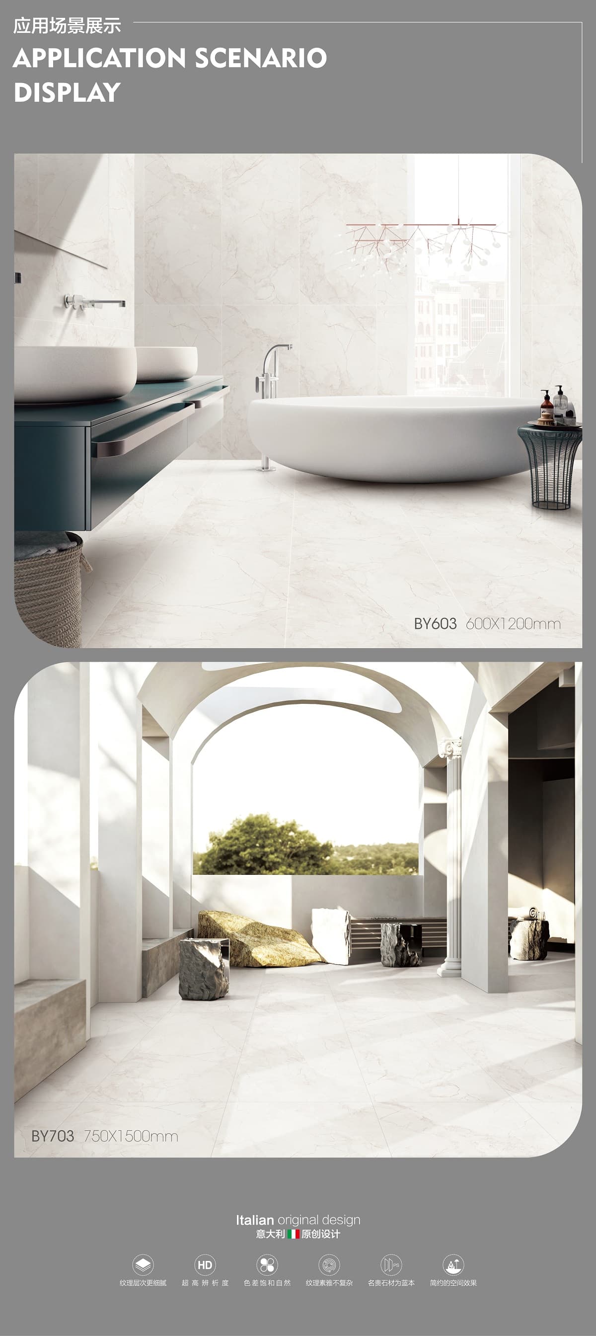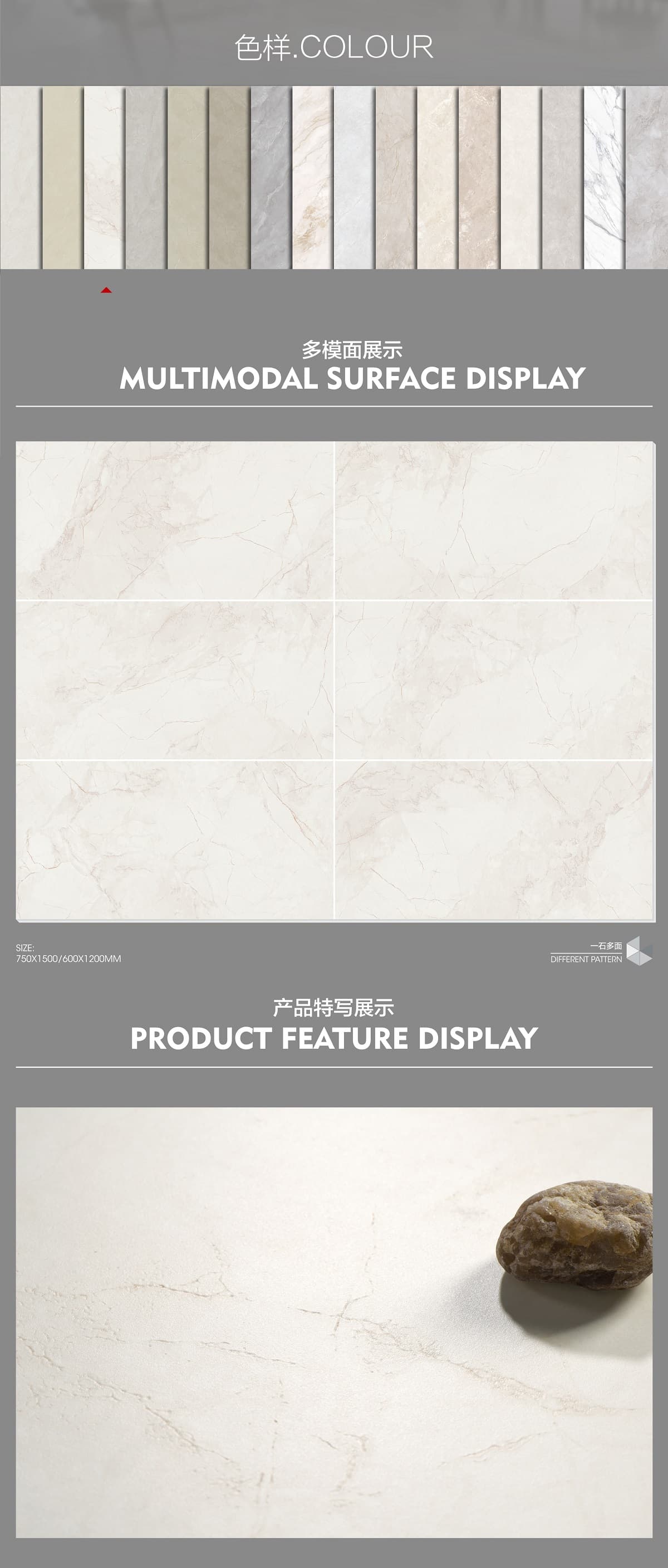 | 產(chǎn)品特性 | 表面柔和,防污效果強,防滑R10指標高,抗折強度好 |